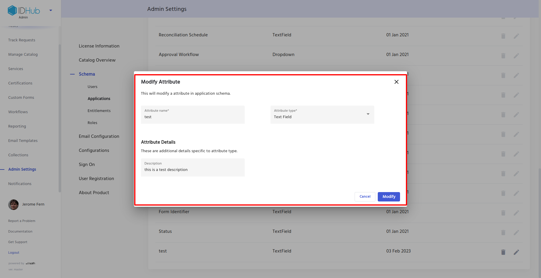 • Here you can modify the attribute name, type and description and click on modify button to edit that attribute.