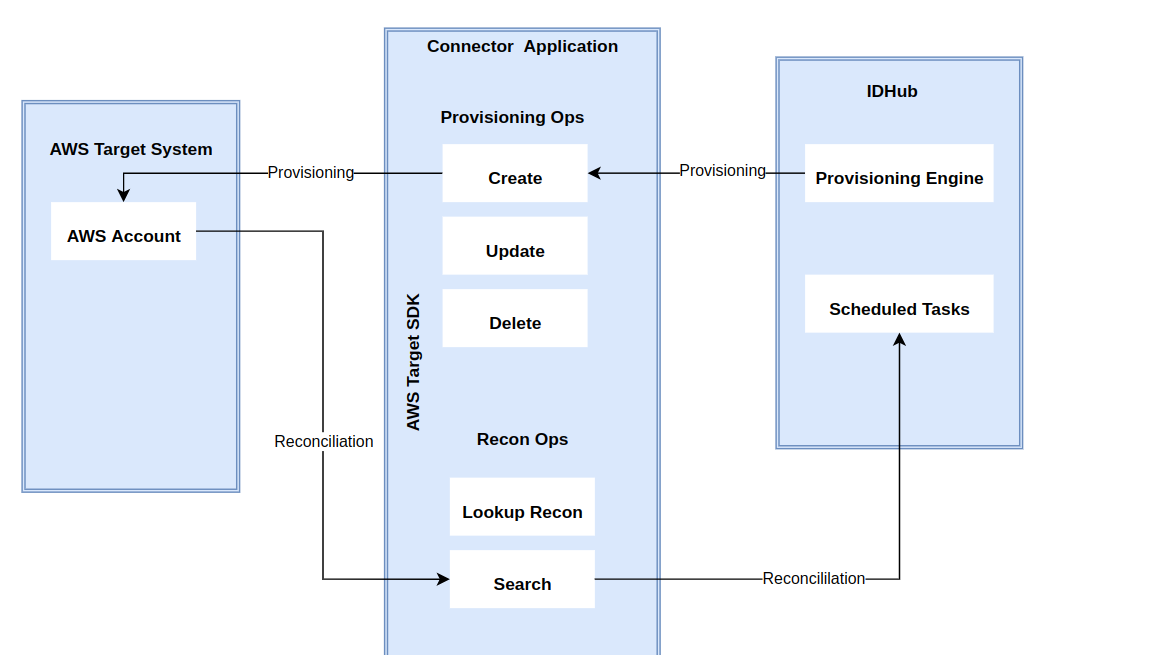 The connector's architecture is constructed in accordance with the diagram below: The connector architecture primarily consists of a connector application and a target system component. The native communication with the target system is handled by the target system by leveraging the IDHub implementation of the AWS Specific connection. This architecture is implemented because it allows for rapid and straightforward connector deployment as well as precise versioning capabilities. AWS APIs is used for provisioning and reconciliation from Amazon Web Services instance.