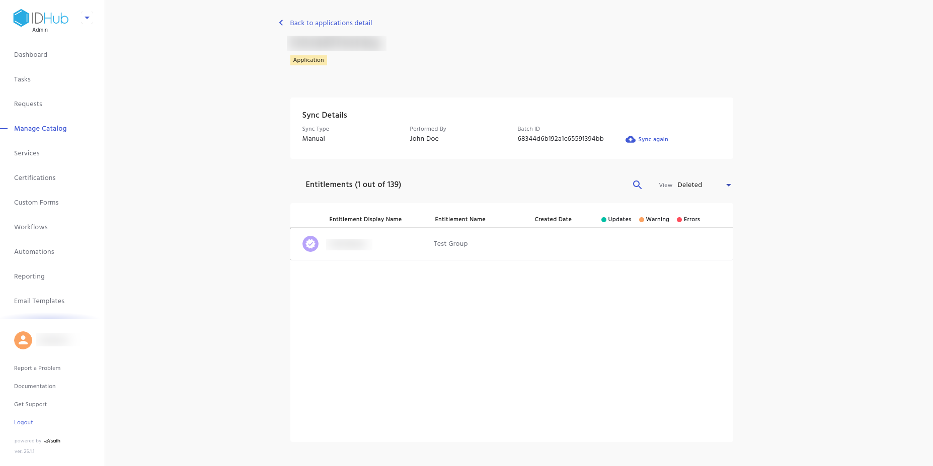- If there is an request associated with the deleted entitlement, then IDHub would show “Deleted Entitlement” (instead of the entitlement name) for that request in the request card and request details page.