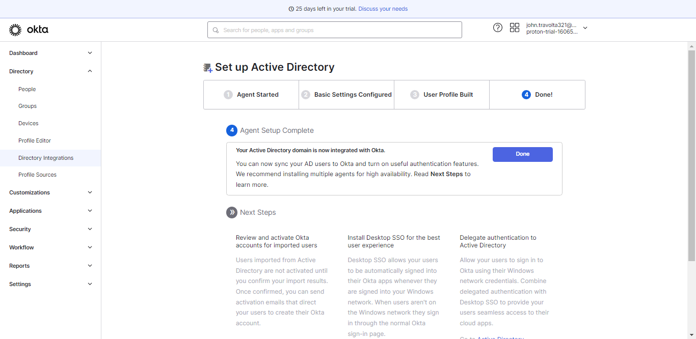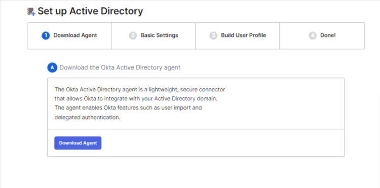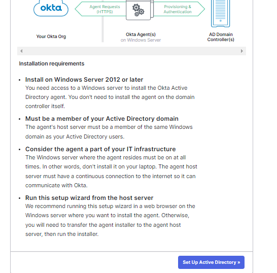 • Setup Active Directory with Okta Active Directory agent. (discussed below)