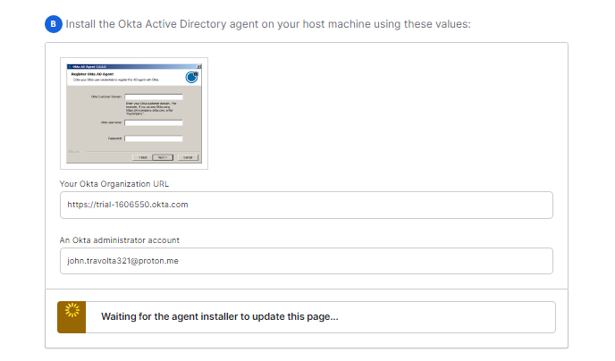 The okta agent file would be automatically downloaded. Now you need to login to your AD server and install the agent at your AD server. Make sure that you login to AD server as an administrator. While installing the agent at your AD server, it would ask for the Okta organisation URL, which is given in the screen below: