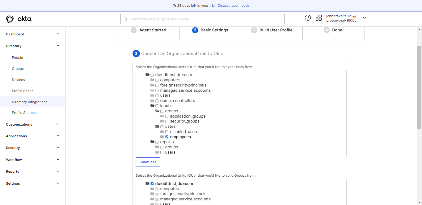 This is the basic settings screen, where you would be able to set and select the OU (organizational units) from where you need okta to sync users from. For example: As you can see in the screen shot below, if the users in the AD server lies under ‘IDHub’ folder → users → employees, then that you need to select the same in this screen. Similarly as per the location of the groups in your AD server you can do select the required folder for the groups too in this screen.