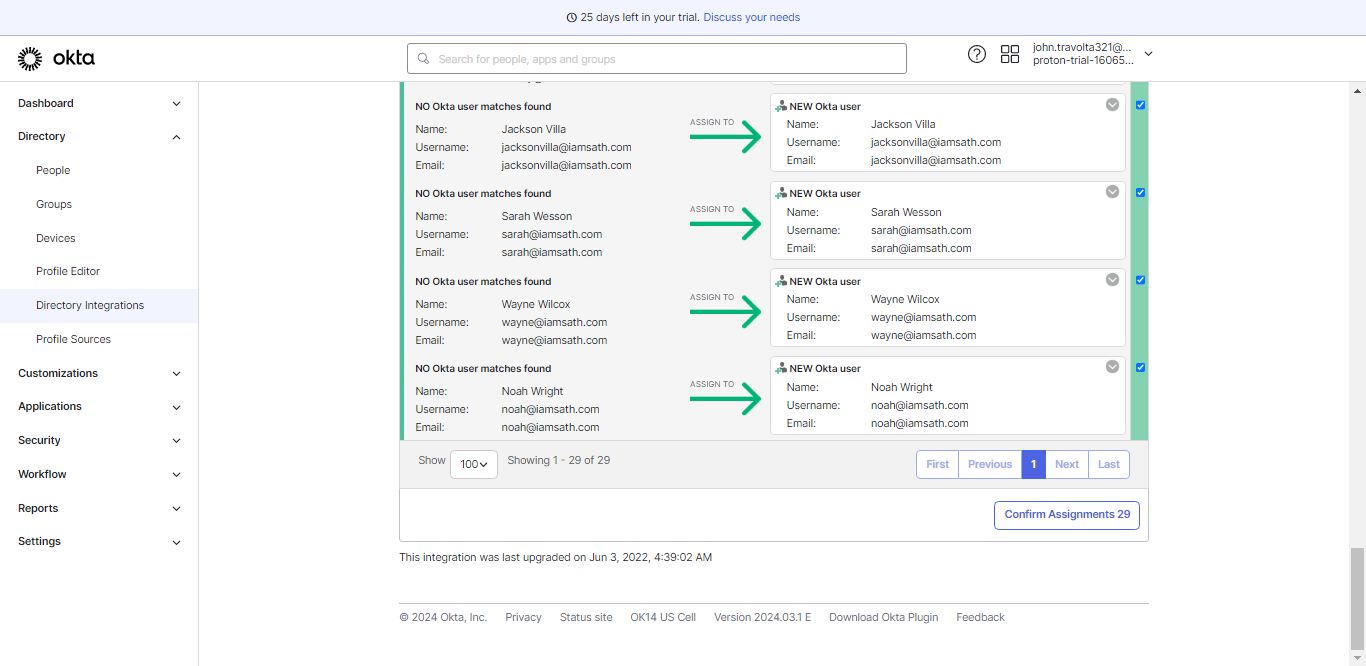 Here okta shows the details of the users and if there is no match, it shows new okta user would be created. And if there is match, it also shows that there is a match. Now for every option, you have the option of either ignoring the user or over-write the details with the existing user or simply create the new user in okta.