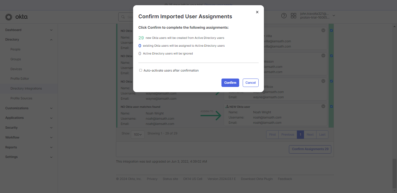 In this screen, this shows that 29 users would be synced from AD to OKTA, you can confirm the same or continue to make changes in the previous screen. Once you click on the confirm button, Okta would create or update the users from your AD server instance accordingly.