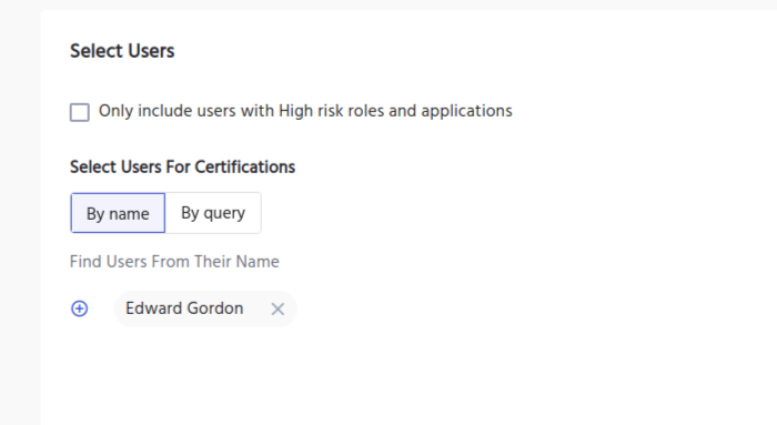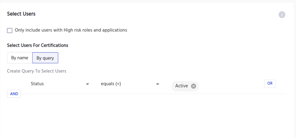 • In this option, you can create a query condition per guidelines to develop a list of users for certification. Selection of “only include users with high-risk roles and applications” will filter your list further.