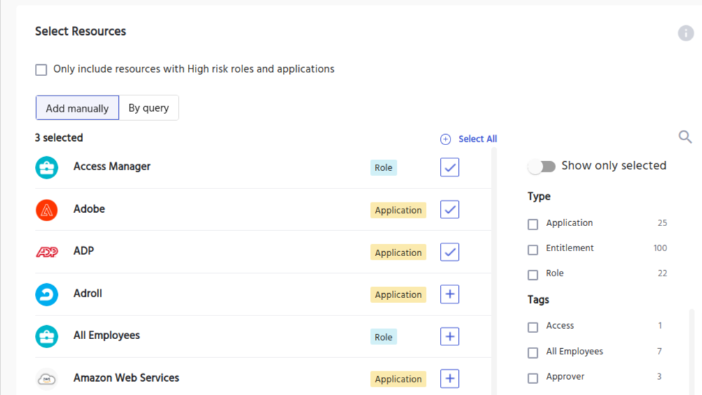 • In this option, you can add the resources manually to be part of the user access certification. (See screenshot below)
