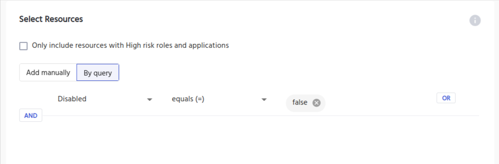 • In this option, you can create a query condition per guidelines to develop a list of resources for certification. Selection of "only include resources with high-risk roles and applications" will filter your list further.