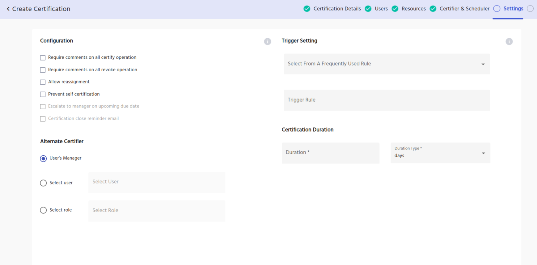 • You can also select any role as the alternate certifier. This means any user who is part of this role would be the alternative certifier for the certification tasks.