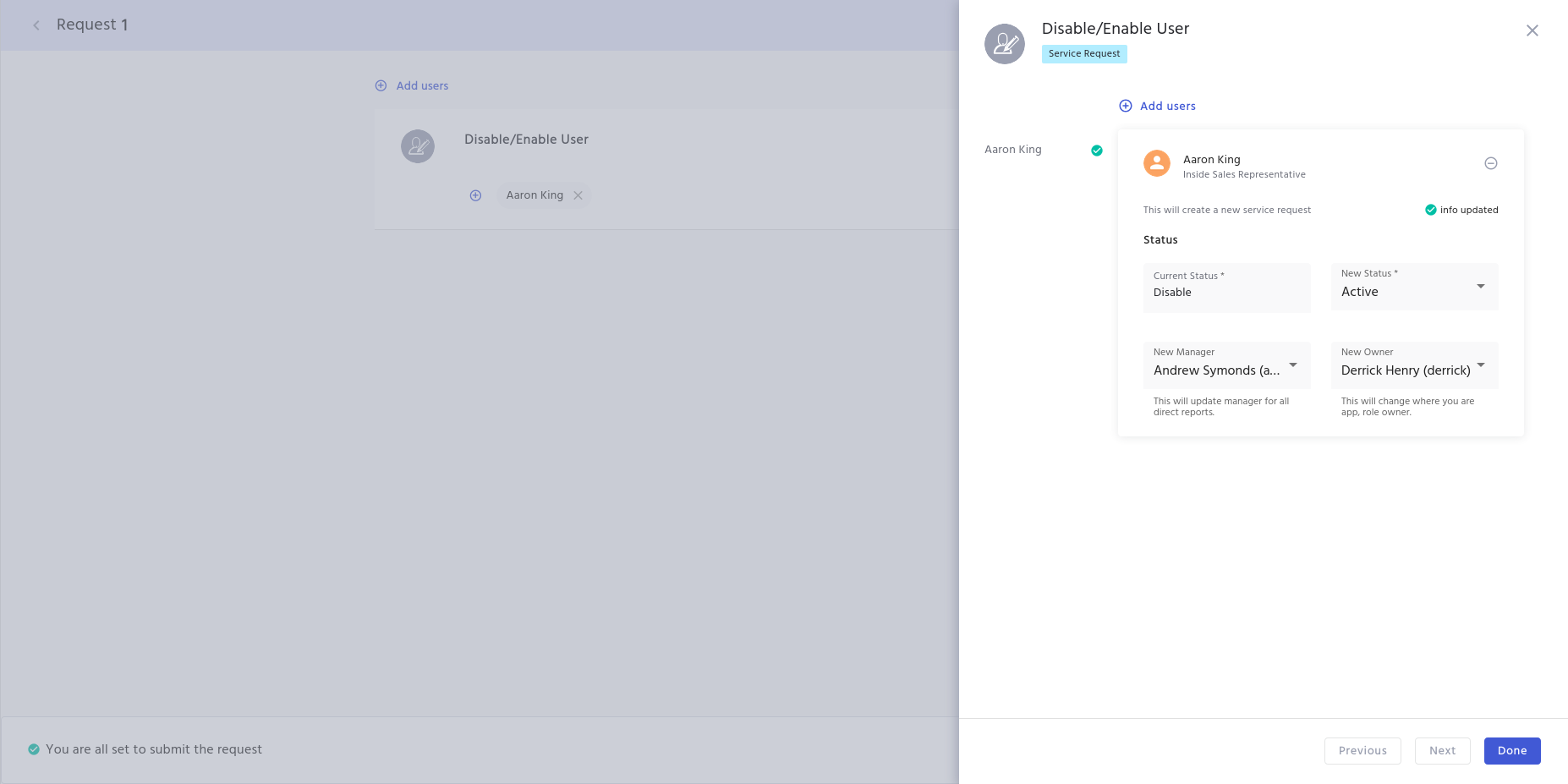 Direct Report & OwnerThe new manager will receive the updates and tasks for the enabled user. The owner of the enabled user will be updated with the new owner.