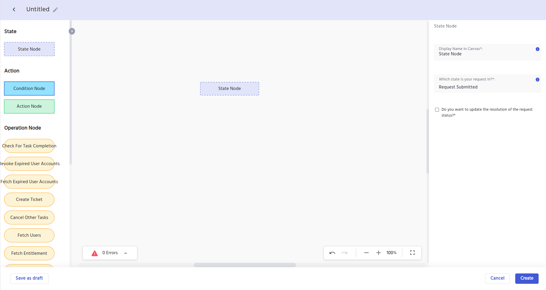 As you continue to build the workflow, errors in the workflow (if any) would show at the bottom left. Click on the errors button to see the list of errors and resolve it accordingly.